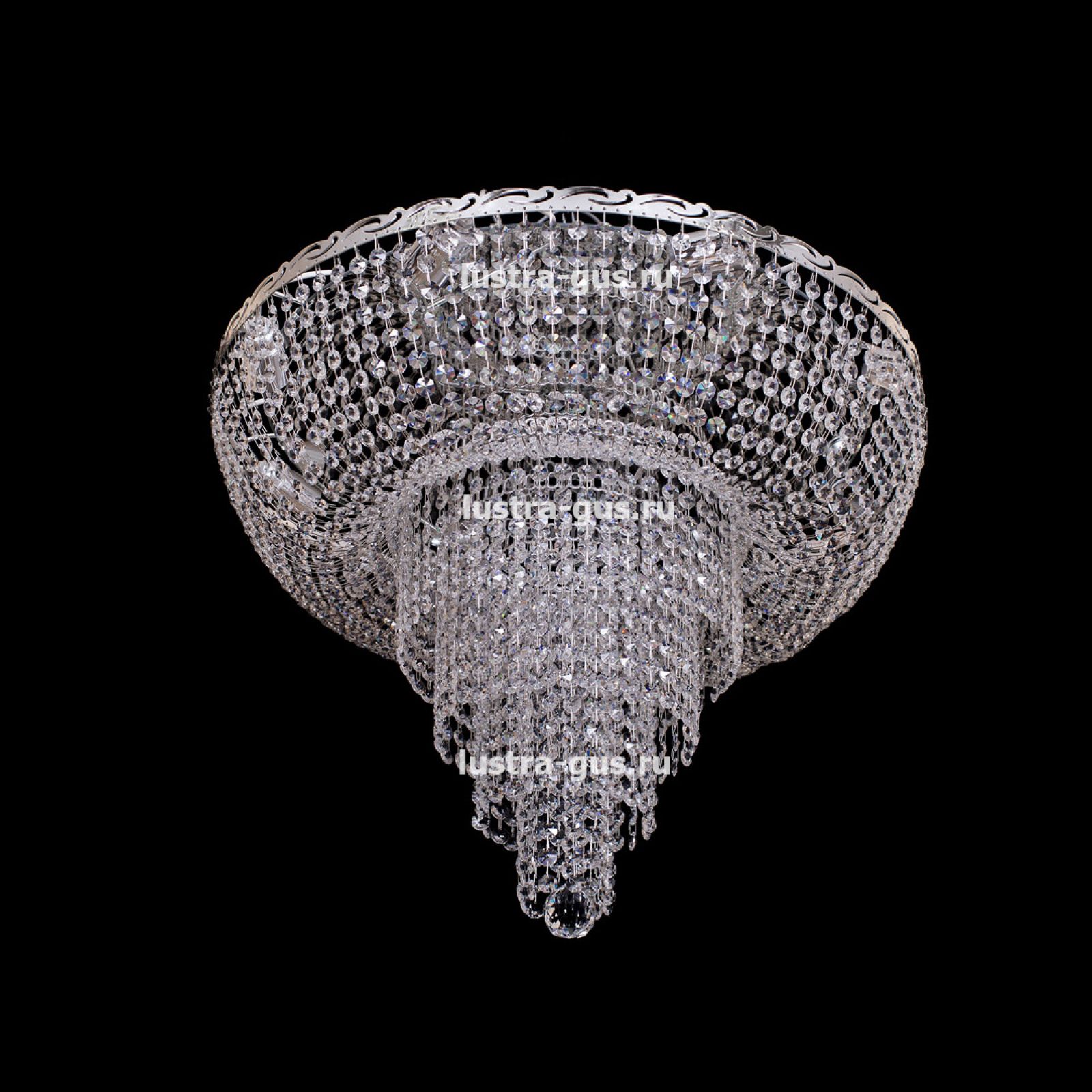 Потолочная люстра Анжелика пирамида обтикон от российского производителя светильников Гусь-Хрустальный идеально подойдет для освещения зала, гостиной, спальни. Люстра выполнена в классическом стиле с изящными хрустальными подвесками. Арматура светильника выполнена из металла, цоколь - E27. Цвет арматуры - золотой или серебристый, на выбор. В основании люстры расположено зеркало, которое отражает свет и усиливает освещенность комнаты.